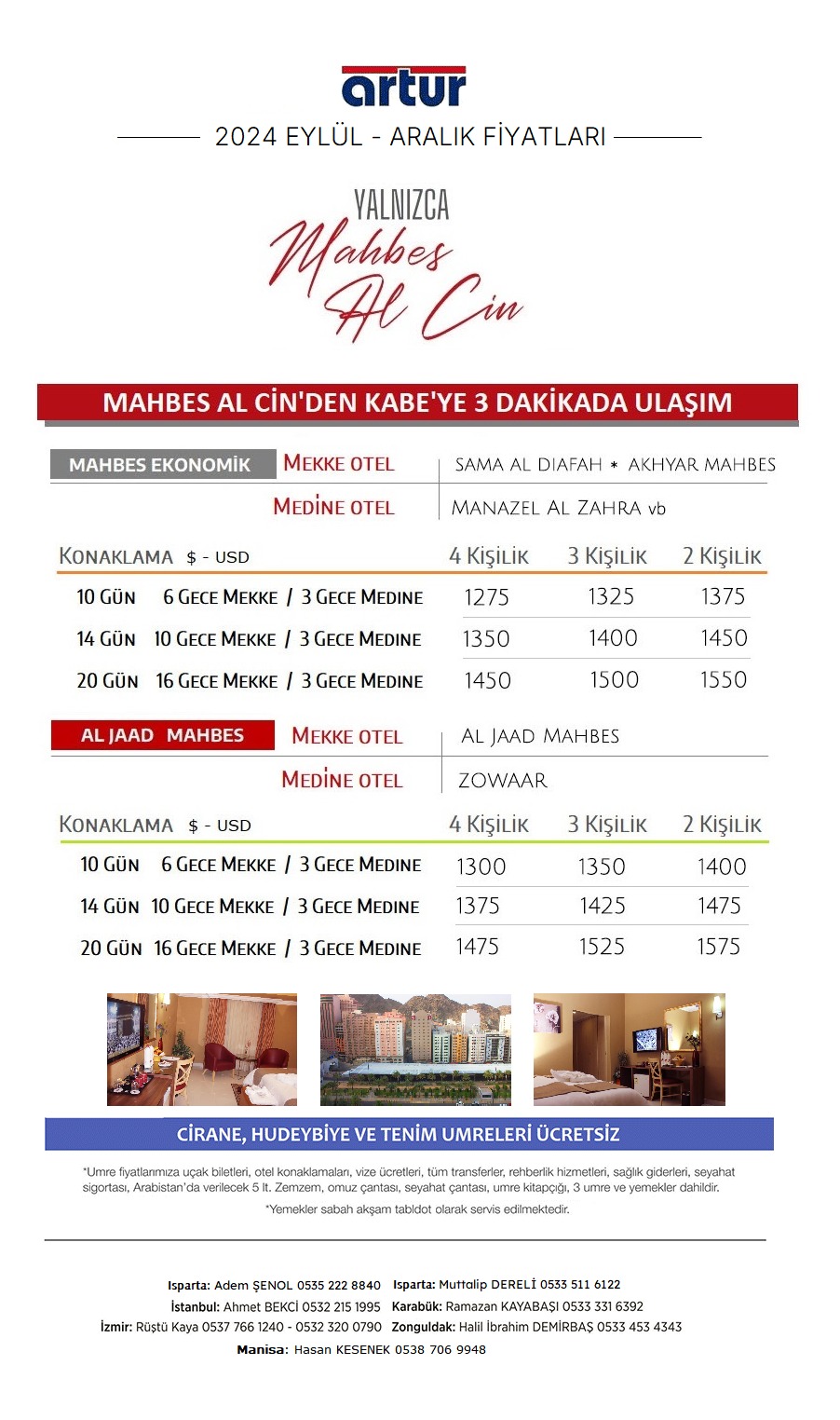 Umre programları sayfamızda detaylı olarak açıklanmıştır. İlgilendiğiniz sizin için uygun olduğuna inandığınız programı bize bildirmeniz durumunda “Huzur ve Güvenle” sloganıyla hizmet vermekte olan profesyonel ekibimiz için için herşeyi planlayacaktır.